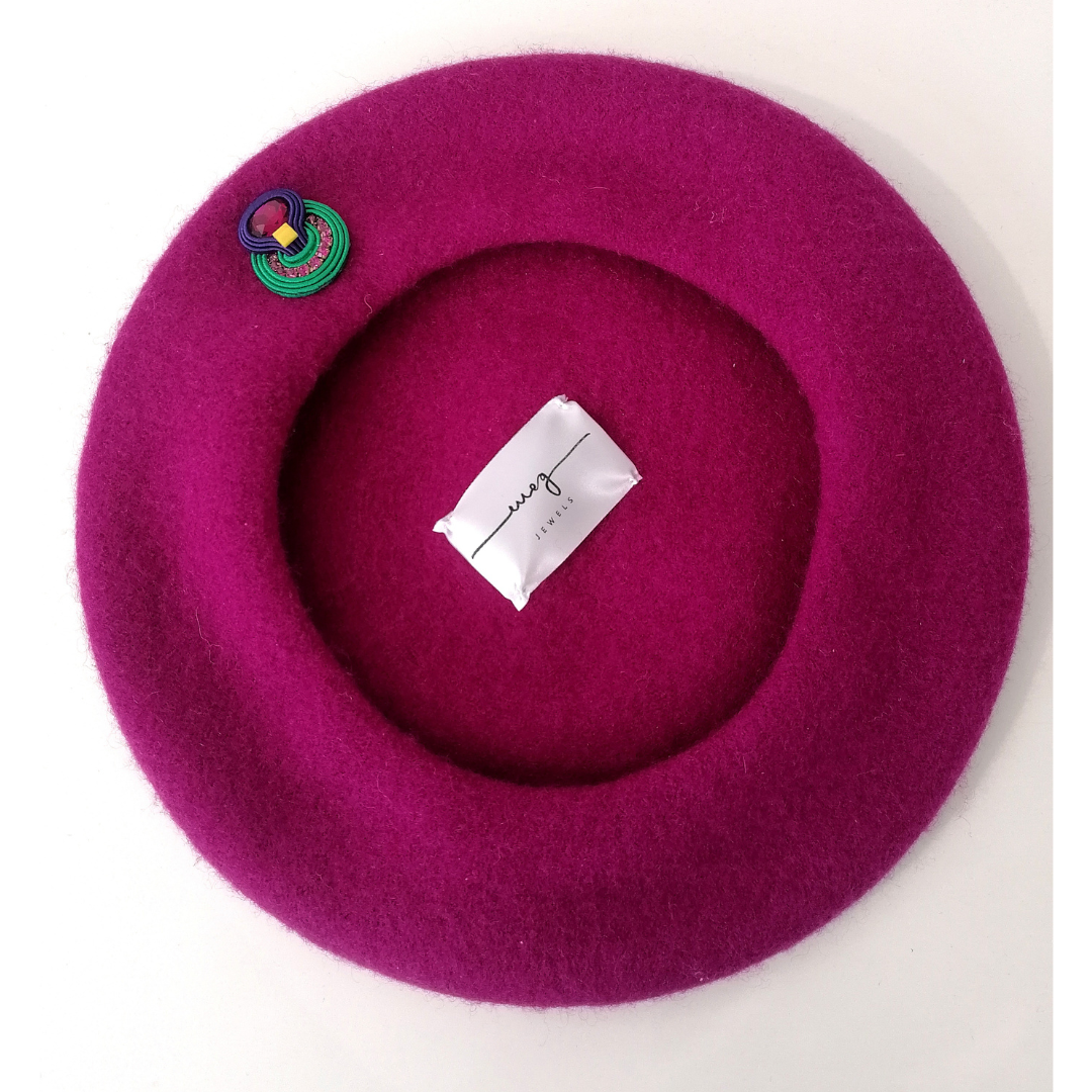 Basco in vera lana (90%), taglia unica. Gioiello interamente cucito a mano con intrecci di filati italiani e cristalli premium. Colore viola; gioiello verde, viola, giallo, fucsia.