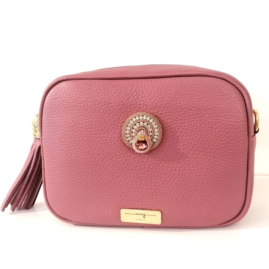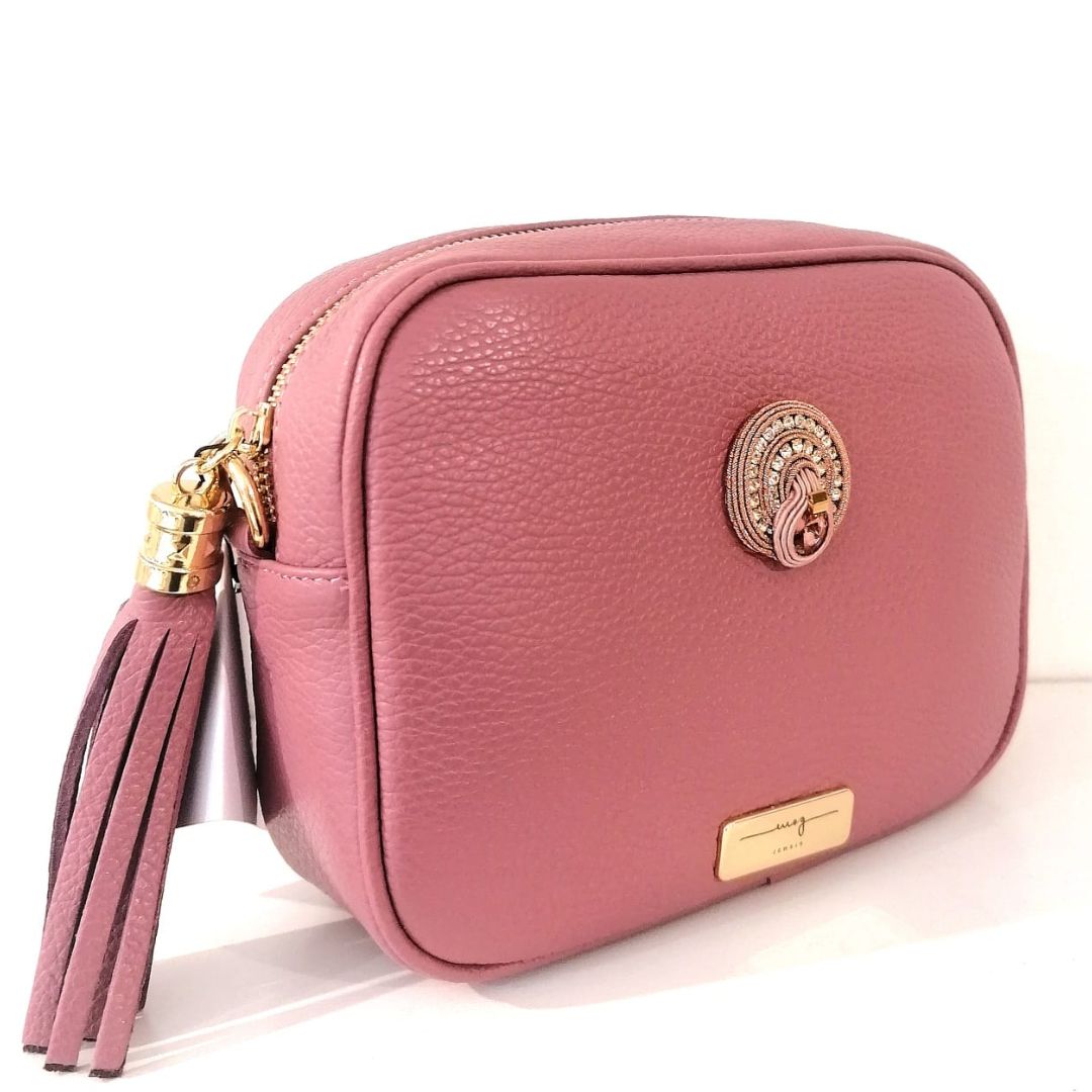 Borsa in vera pelle Made in Italy, con gioiello interamente cucito a mano: realizzato con intrecci di filati italiani, cristalli premium, finiture in Alcantara. Chiusura con zip, tracolla in pelle, regolabile ed estraibile, nappina in pelle. Dimensioni: base 20 cm, altezza 15 cm, larghezza 7 cm. Colore borsa: rosa. Colore gioiello: rosa, oro. Certificato di garanzia e autenticità.