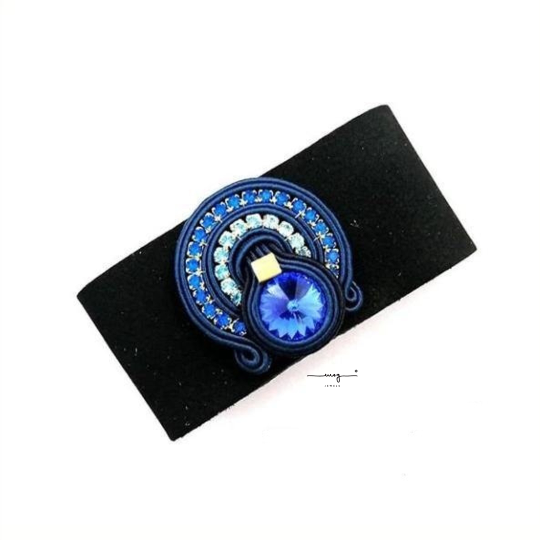Bracelet from 'Galaxy' Collection by MEG Jewels. Entirely hand-sewn on leather, made of italian yarns, premium crystals, Alcantara. Certificate of guarantee and authenticity. Colors: balck, blue, gold.