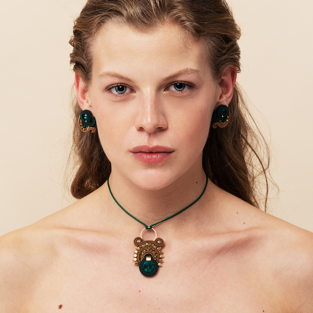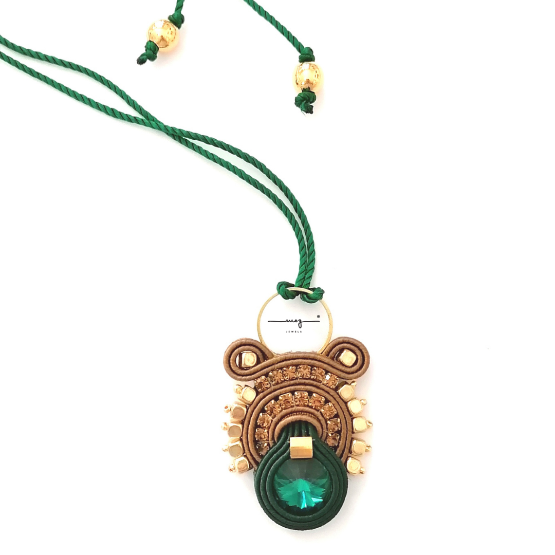 Pendant necklace from "Bamboo" Collection by MEG Jewels®. Entirely hand-sewn, made of italian yarns, premium crystals, Alcantara. Certificate of guarantee and authenticity. Brown an dark green color, gold details.