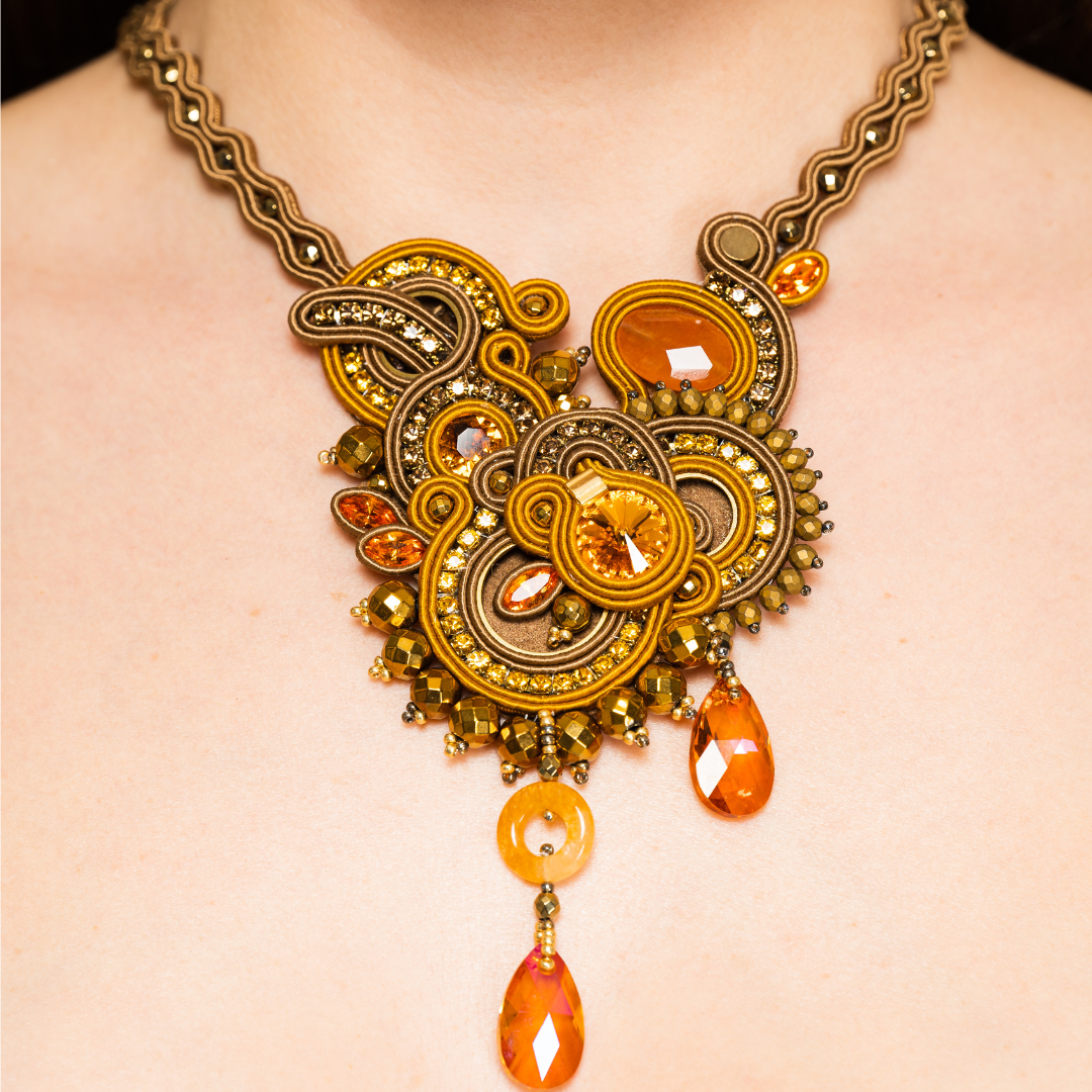 Statement necklace, "Fenix" Collection by MEG Jewels ®. Entirely hand-sewn, made of italian yarns, premium crystals, Alcantara. Certificate of guarantee and authenticity.