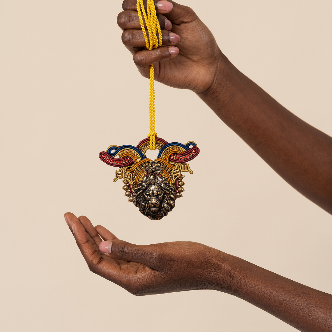 Interamente cucita a mano, realizzata con intrecci di filati italiani, inserti vintage in ottone, cristalli premium, finiture in Alcantara. Certificato di garanzia e autenticità. Colori: terracotta, ciliegia, blu, dettagli oro. Dimensioni ciondolo L 8cm x H 10cm.