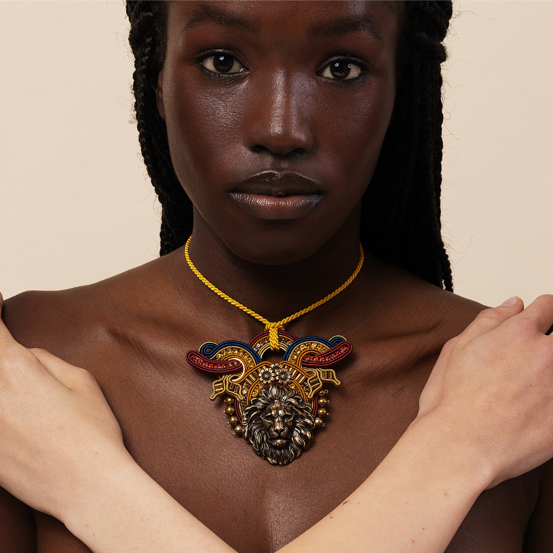 Necklace 'Strenght' from 'Fortune Tellers' Collection by MEG Jewels ®. Entirely hand-sewn, made of Italian yarns, premium crystals, vintage brass details, Alcantara. Certificate of guarantee and authenticity.