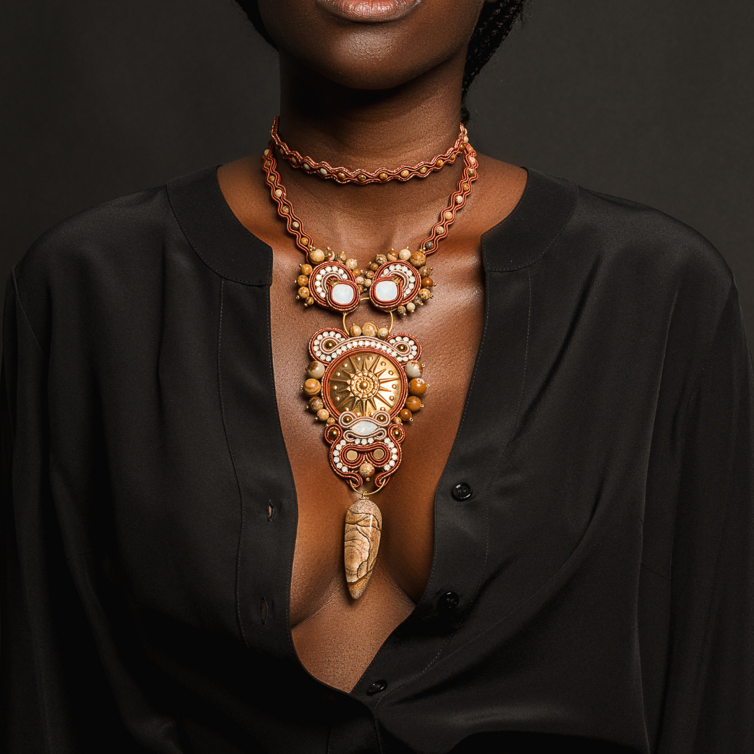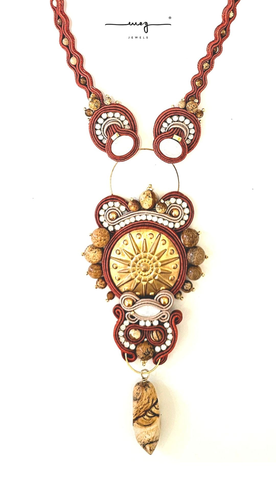 Entirely hand-sewn, the necklace from MASAI Collection by MEG Jewels® is made of italian yarns, premium crystals, ematite, diaspro and gold plated 24k details, Alcantara. Certificate of guarantee and authenticity.