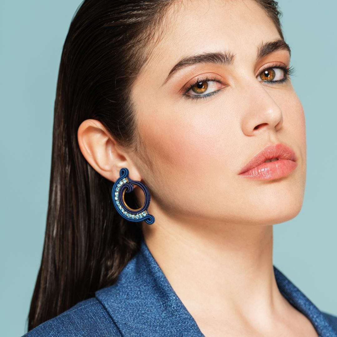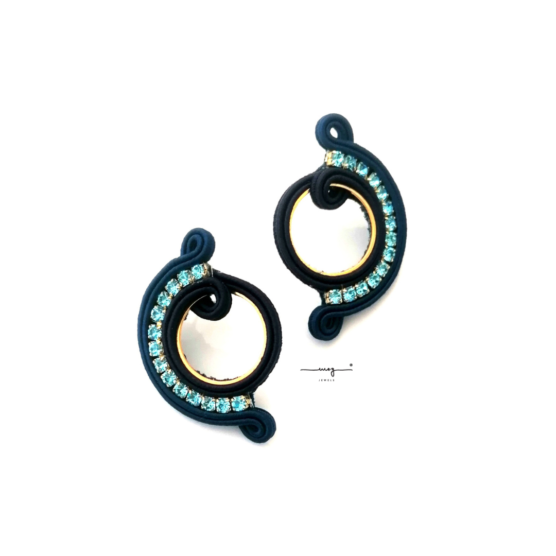 Medium size earrings from Galaxy Collection by MEG Jewels®. Entirely hand-sewn, made of italian yarns, premium crystals, nickel free pins, Alcantara. Certificate of guarantee and authenticity.