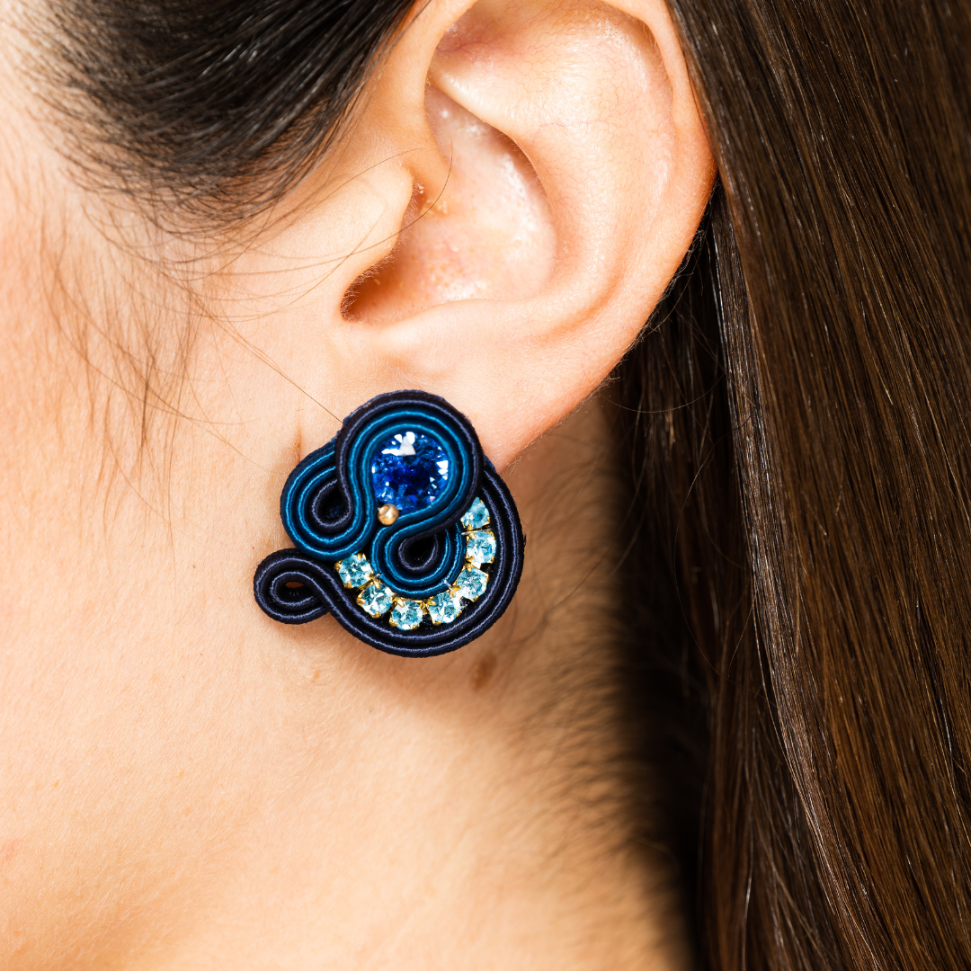 Small size earrings from Galaxy Collection by MEG Jewels®. Entirely hand-sewn, made of italian yarns, premium crystals, nickel free pins, Alcantara. Certificate of guarantee and authenticity.