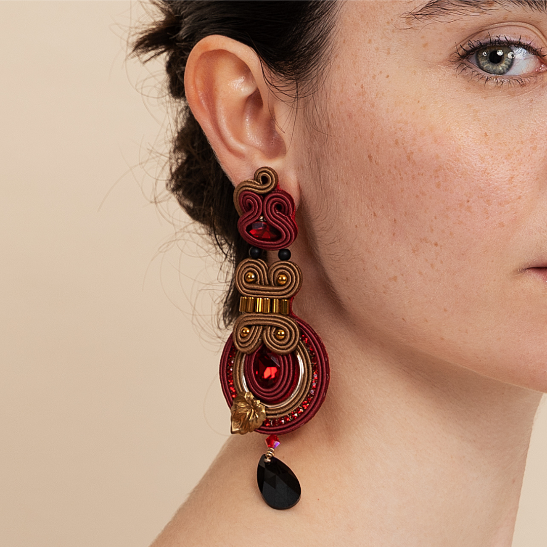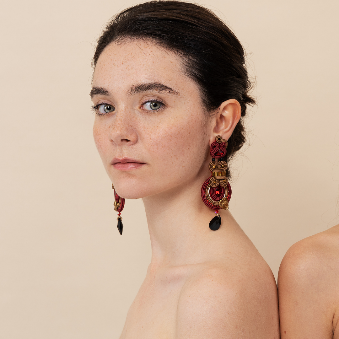 Orecchini misura lunga, Collezione ORIENTE by MEG Jewels®. Colori: nero, ciliegia e oro.