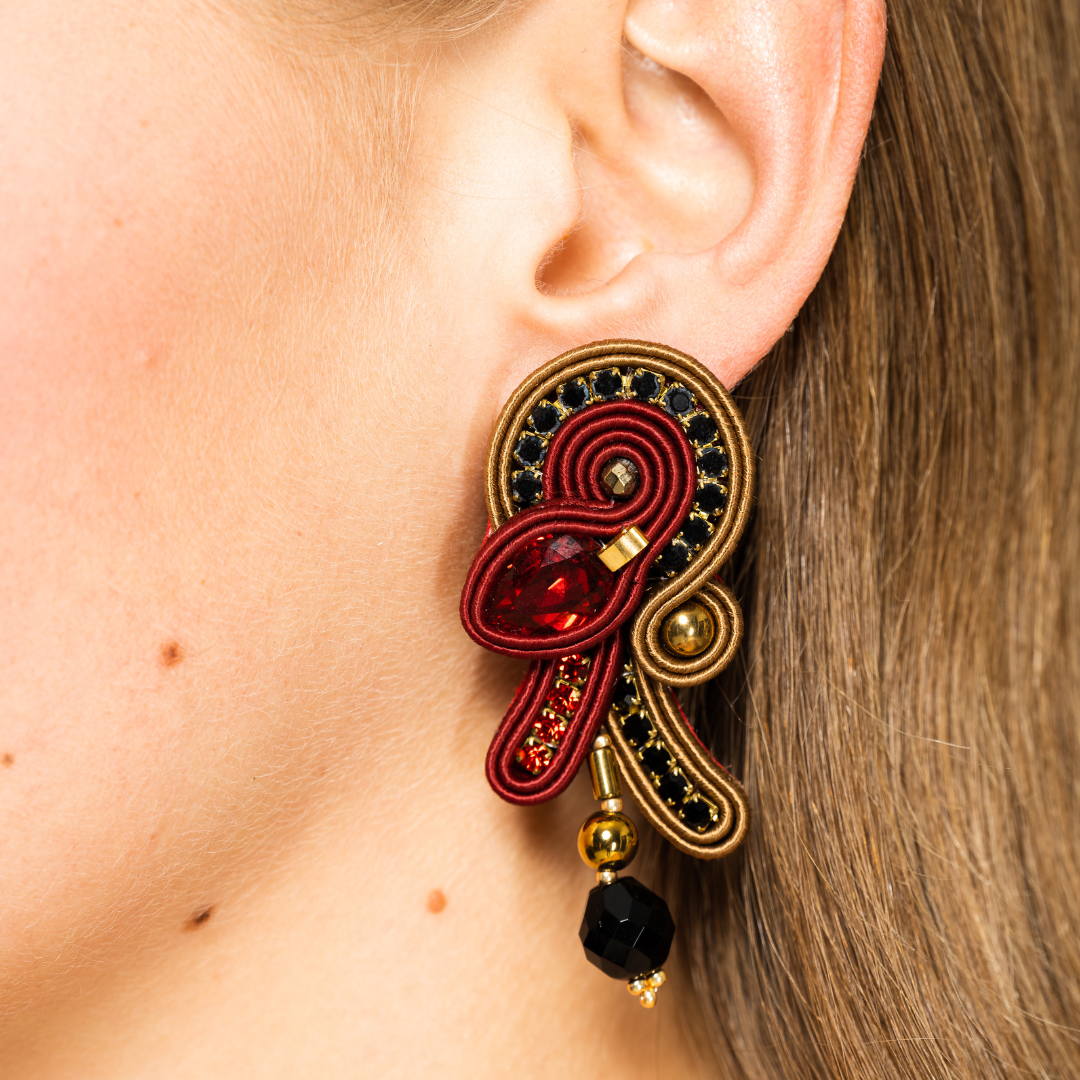 Earrings medium size, 'Oriente' Collection by MEG Jewels®. Entirely hand-sewn, made of Italian yarns, premium crystals, nickle free pins, Alcantara. Certificate of guarantee and authenticity.