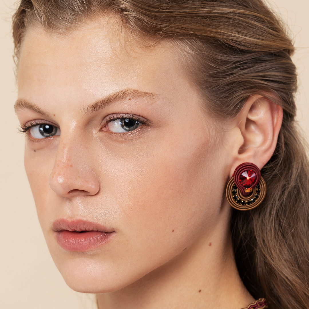 Earrings small size, 'Oriente' Collection by MEG Jewels®. Entirely hand-sewn, made of Italian yarns, premium crystals, nickle free pins, Alcantara. Certificate of guarantee and authenticity.