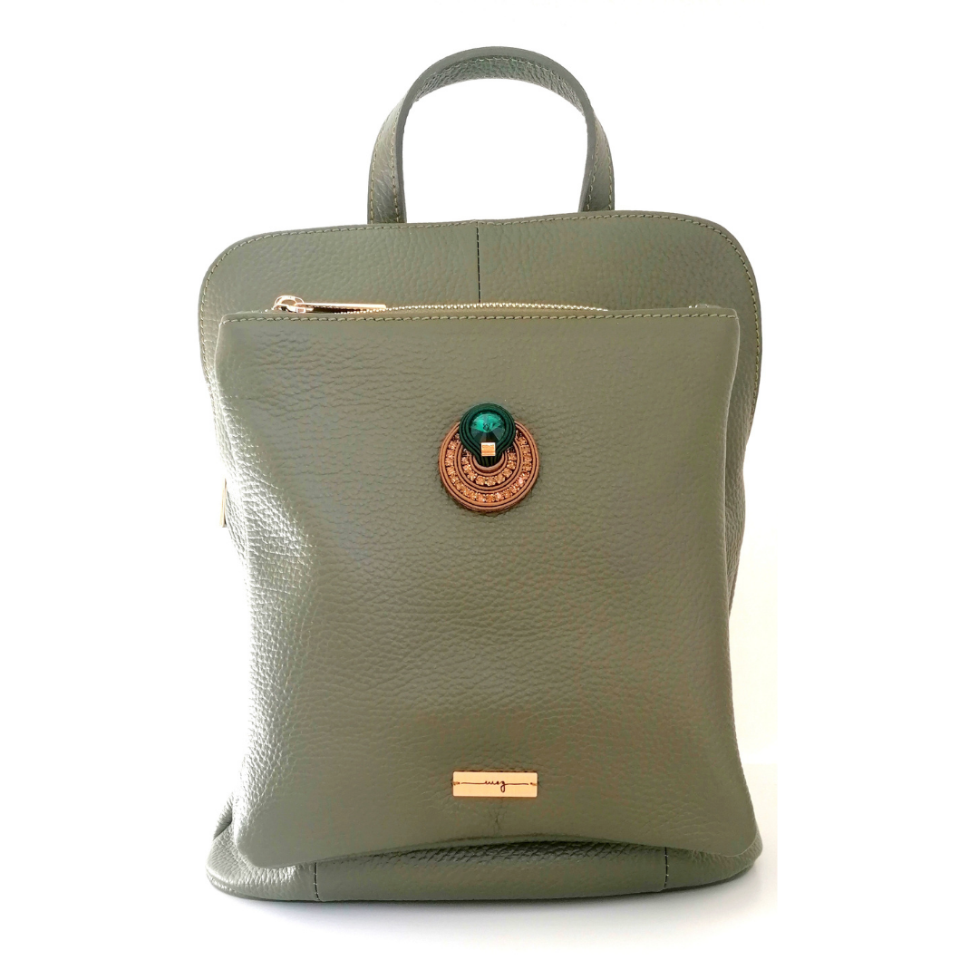 Zaino in vera pelle Made in Italy, con gioiello interamente cucito a mano: realizzato con intrecci di filati italiani, cristalli premium, finiture in Alcantara originale. Chiusura con zip, tasche esterne, doppio scomparto interno con zip, bretelle regolabili. Trasformabile in borsa a tracolla. Dimensioni: base 25cm, altezza 30cm, profondità 11cm. Colore borsa: verde militare. Colore gioiello: verde, cammello.