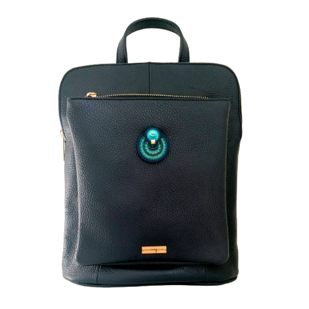 Zaino in vera pelle Made in Italy, con gioiello interamente cucito a mano: realizzato con intrecci di filati italiani, cristalli premium, finiture in Alcantara. Chiusura con zip, tasche esterne, doppio scomparto interno con zip, bretelle regolabili. Trasformabile in borsa a tracolla. Dimensioni: base 25cm, altezza 30cm, profondità 11cm. Colore borsa: blu. Colore gioiello: blu, petrolio.