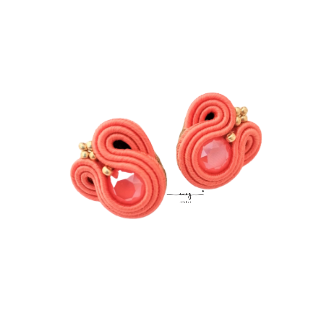 Entirely hand-sewn, the 'BabyMEG' extrasmall earrings by MEG Jewels® are made of italian yarns, premium crystals, nickel free pins, Alcantara. Coral color.