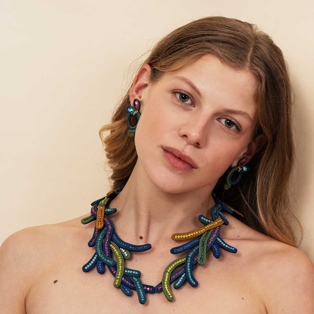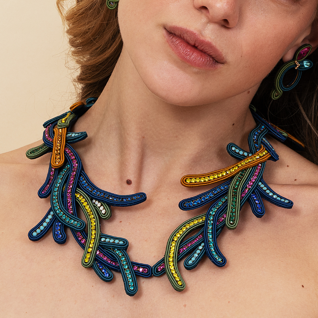 Necklace from "Amazzonia" Collection by MEG Jewels®. Entirely hand-sewn, made of italian yarns, premium crystals, Alcantara. Certificate of guarantee and authenticity.