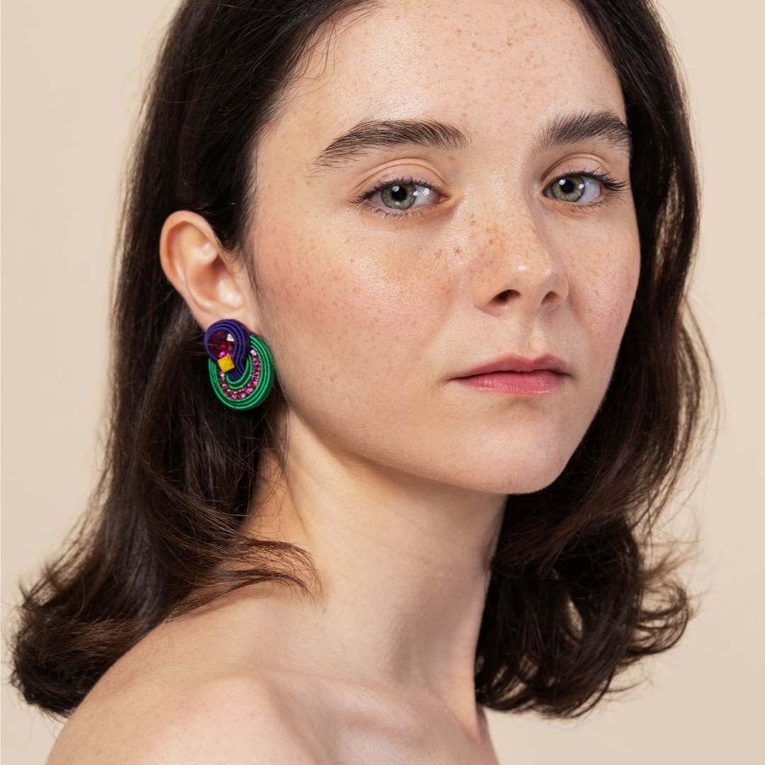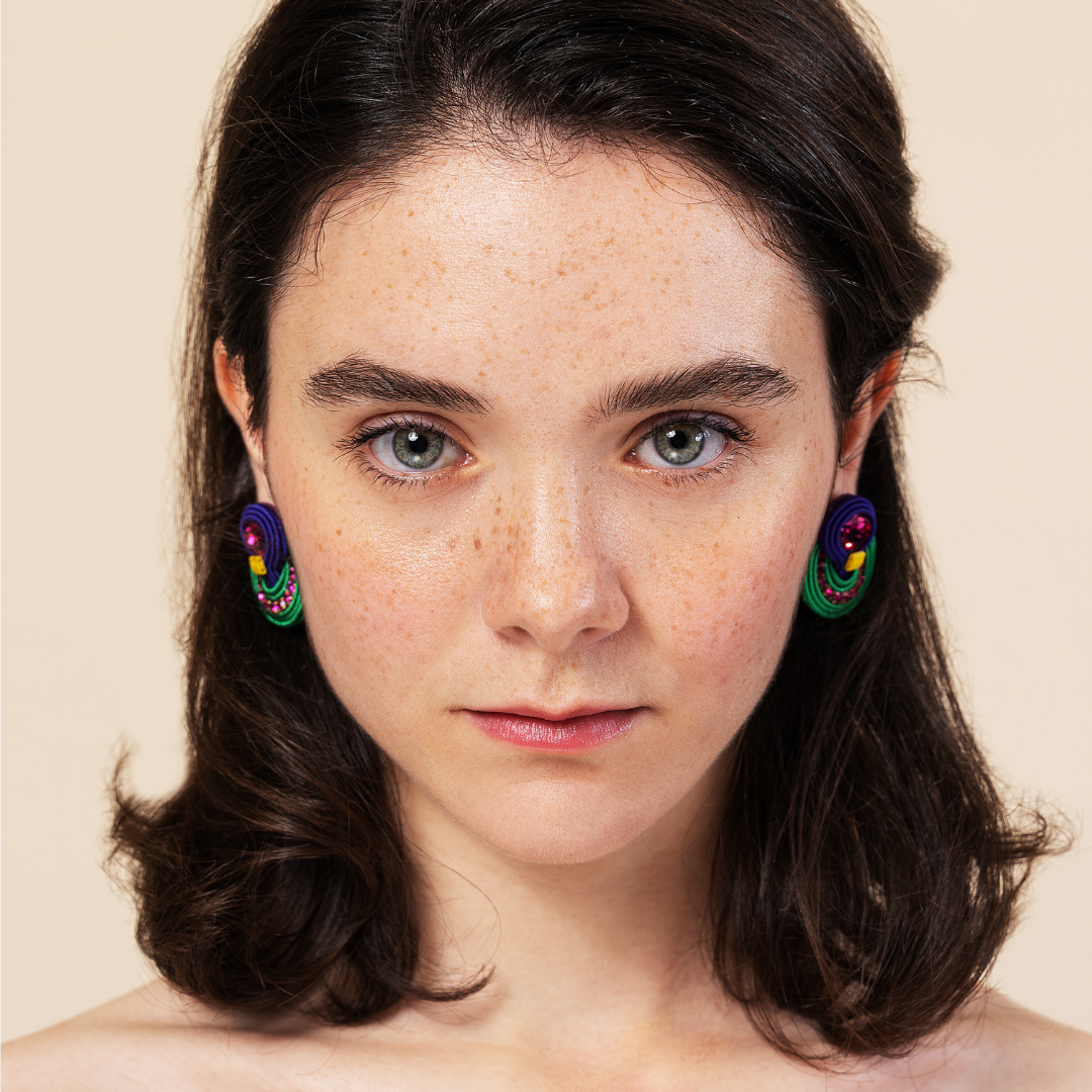 Orecchini misura piccola, Collezione FUSION by MEG Jewels®. Colori viola, verde smeraldo, fucsia.