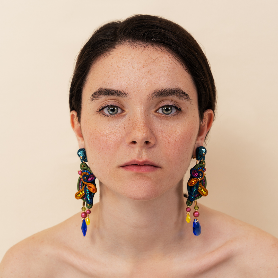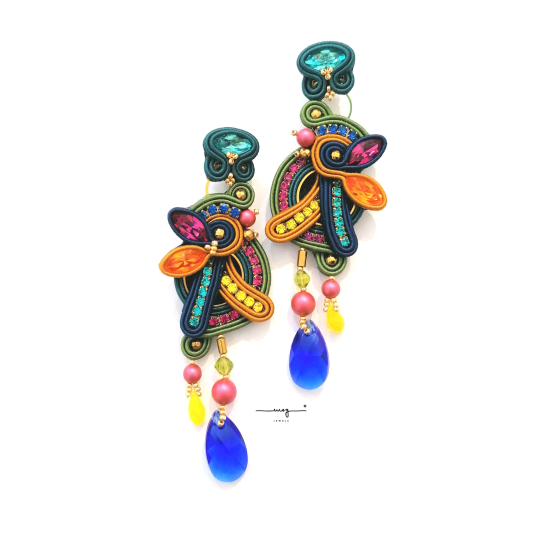 Earrings long size from "Amazzonia" Collection by MEG Jewels ®. Entirely hand-sewn, made of Italian yarns, premium crystals, nickel free pins, Alcantara. Certificate of guarantee and authenticity.