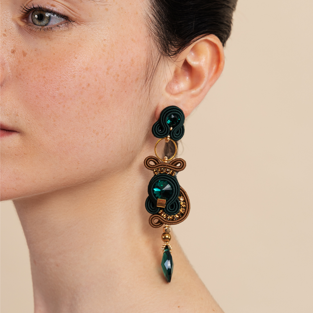 Long size earrings from "Bamboo" Collection by MEG Jewels. Entirely hand-sewn, made of italian yarns, premium crystals, nickel free pins, Alcantara. Certificate of guarantee and exclusivity.