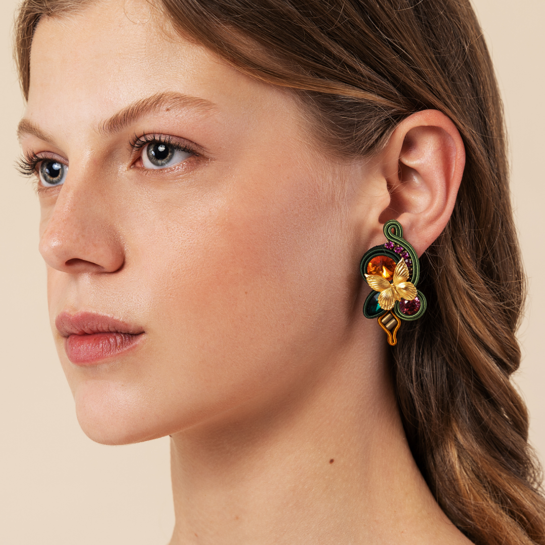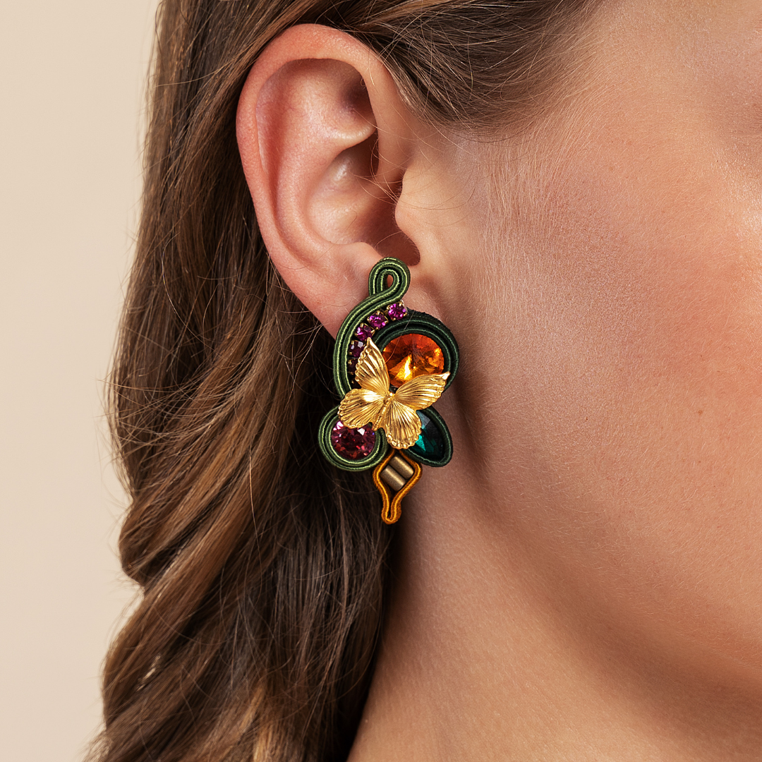 Orecchini misura media 'Magic Fountain', Collezione SECRET GARDEN by MEG Jewels®. Colori: verde, arancione, fucsia e terracotta.