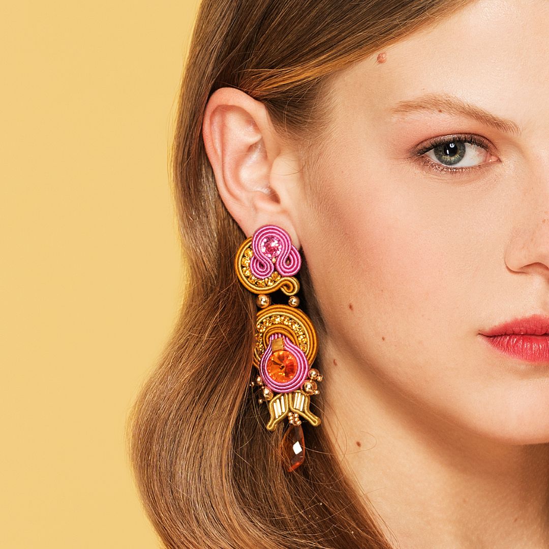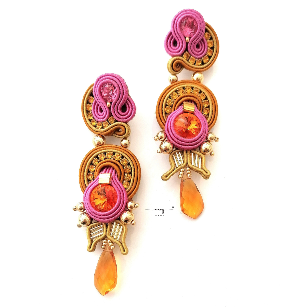 Earrings long size from SUNSET Collection by MEG Jewels®. Entirely hand-sewn, made of Italian yarns, premium crystals, nickel free pins, Alcantara. Pink and orange color. Certificate of guarantee and authenticity.