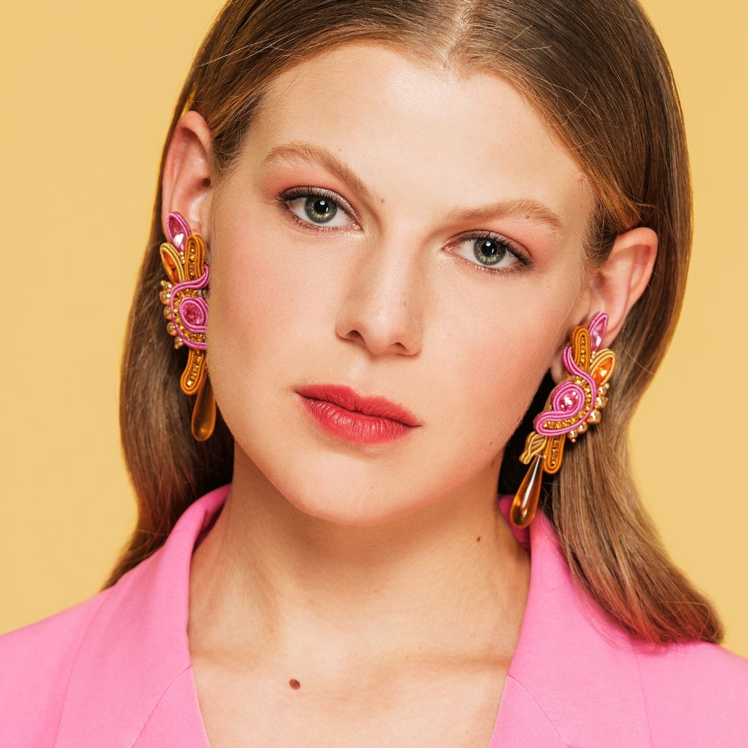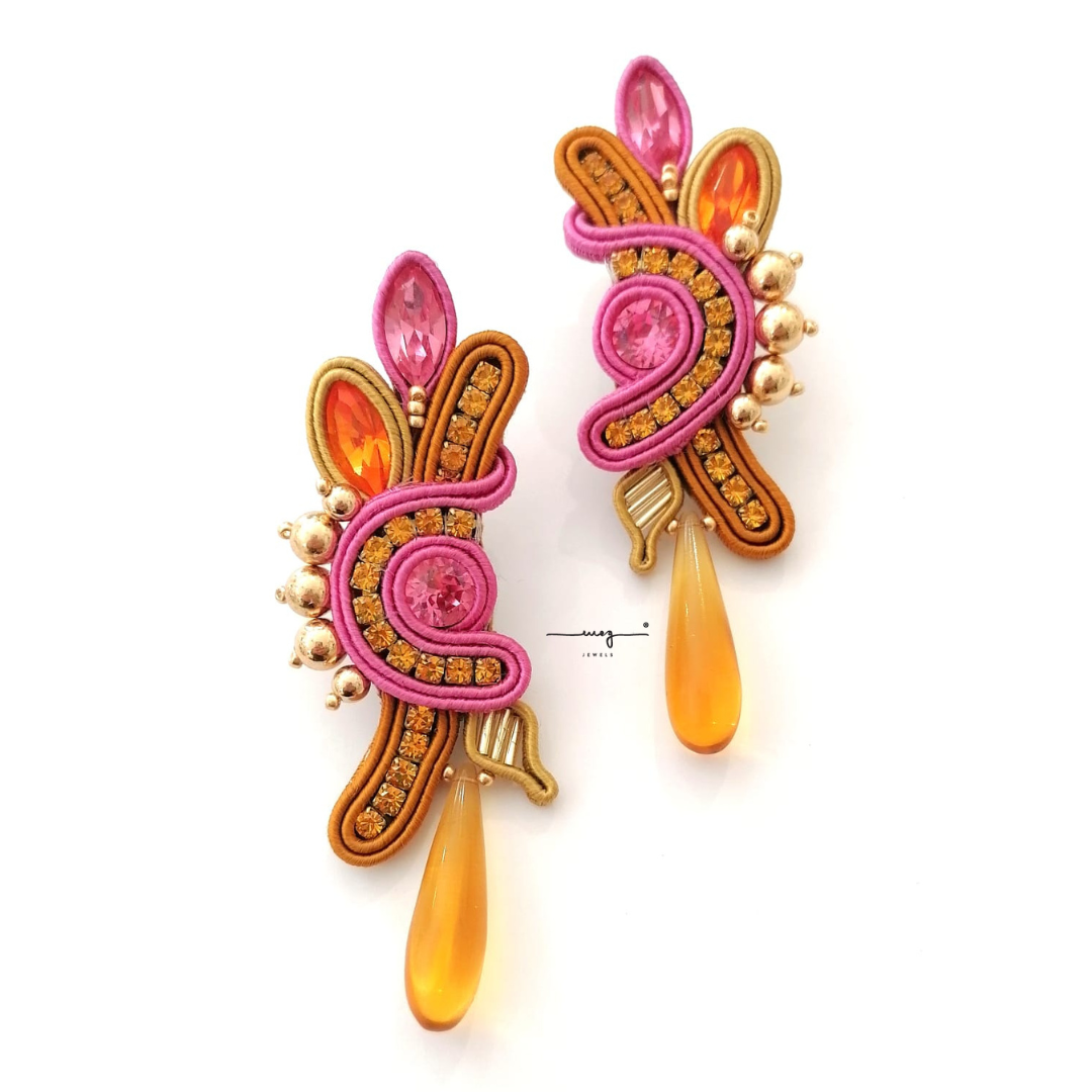 Earrings long size from SUNSET Collection by MEG Jewels®. Entirely hand-sewn, made of Italian yarns, premium crystals, nickel free pins, Alcantara. Pink and orange color. Certificate of guarantee and authenticity.