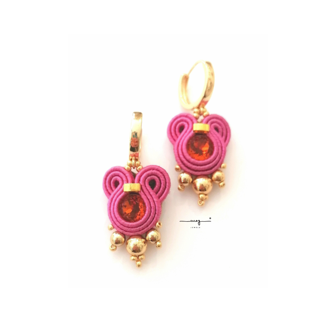 Earrings small size from SUNSET Collection by MEG Jewels®. Entirely hand-sewn, made of Italian yarns, premium crystals, nickel free pins, Alcantara. Pink and orange color. Certificate of guarantee and authenticity.