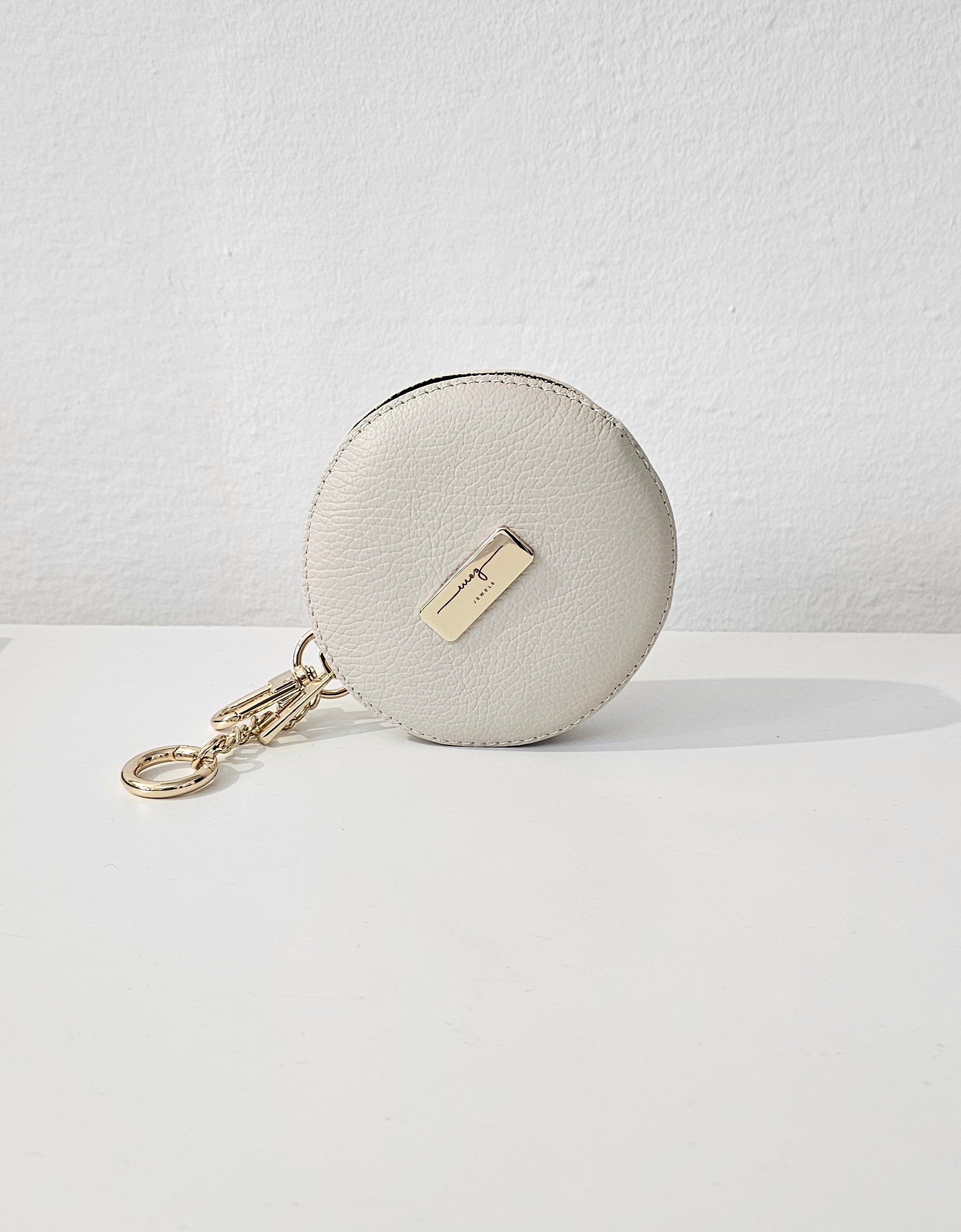 Portatutto tondo in vera pelle Made in Italy. Collezione 'Essentials' by MEG Jewels®. Chiusura con zip, piccola catena con doppio moschettone per attaccarlo alla borsa. Diametro 12 cm. Colore ecru, finiture oro.