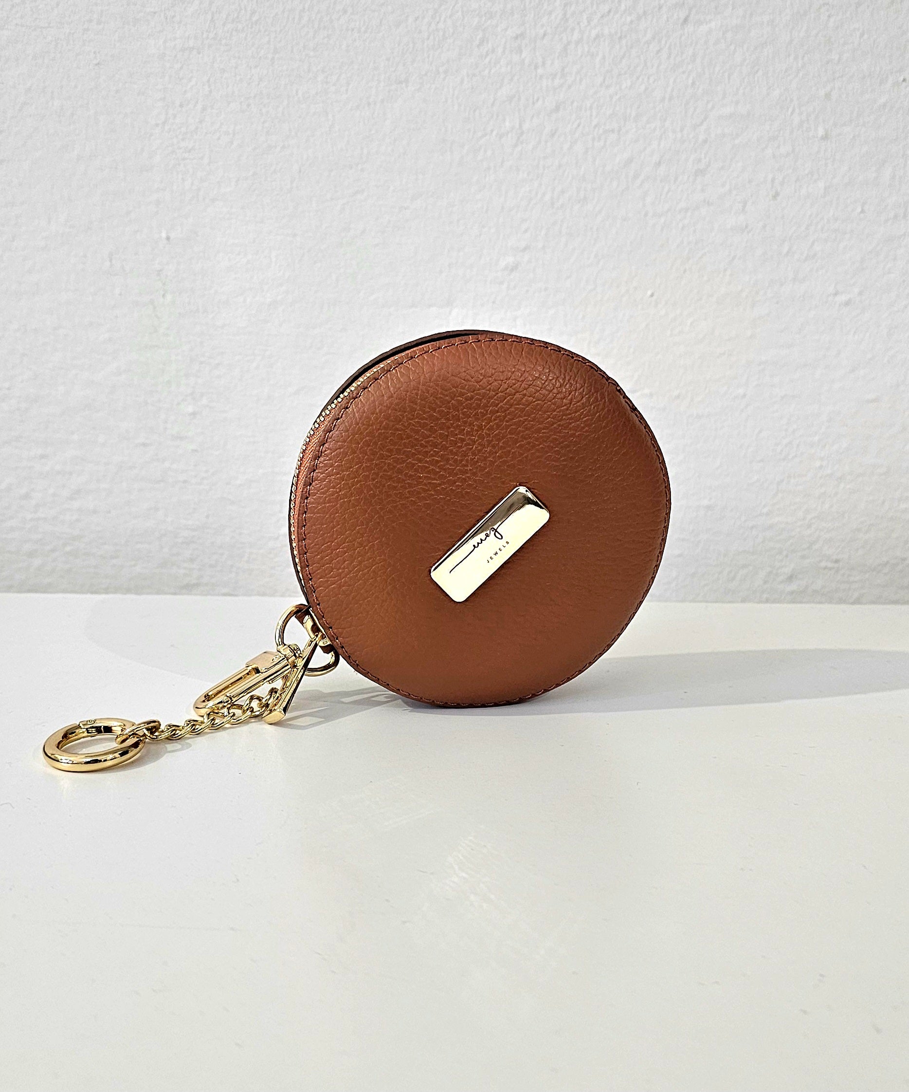 Portatutto tondo in vera pelle Made in Italy. Collezione 'Essentials' by MEG Jewels®. Chiusura con zip, piccola catena con doppio moschettone per attaccarlo alla borsa. Diametro 12 cm. Colore cognac, finiture oro.