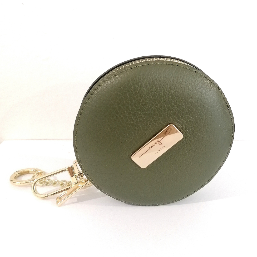 Portatutto tondo in vera pelle Made in Italy. Collezione 'Essentials' by MEG Jewels®. Chiusura con zip, piccola catena con doppio moschettone per attaccarlo alla borsa. Diametro 12 cm. Colore verde finiture oro.